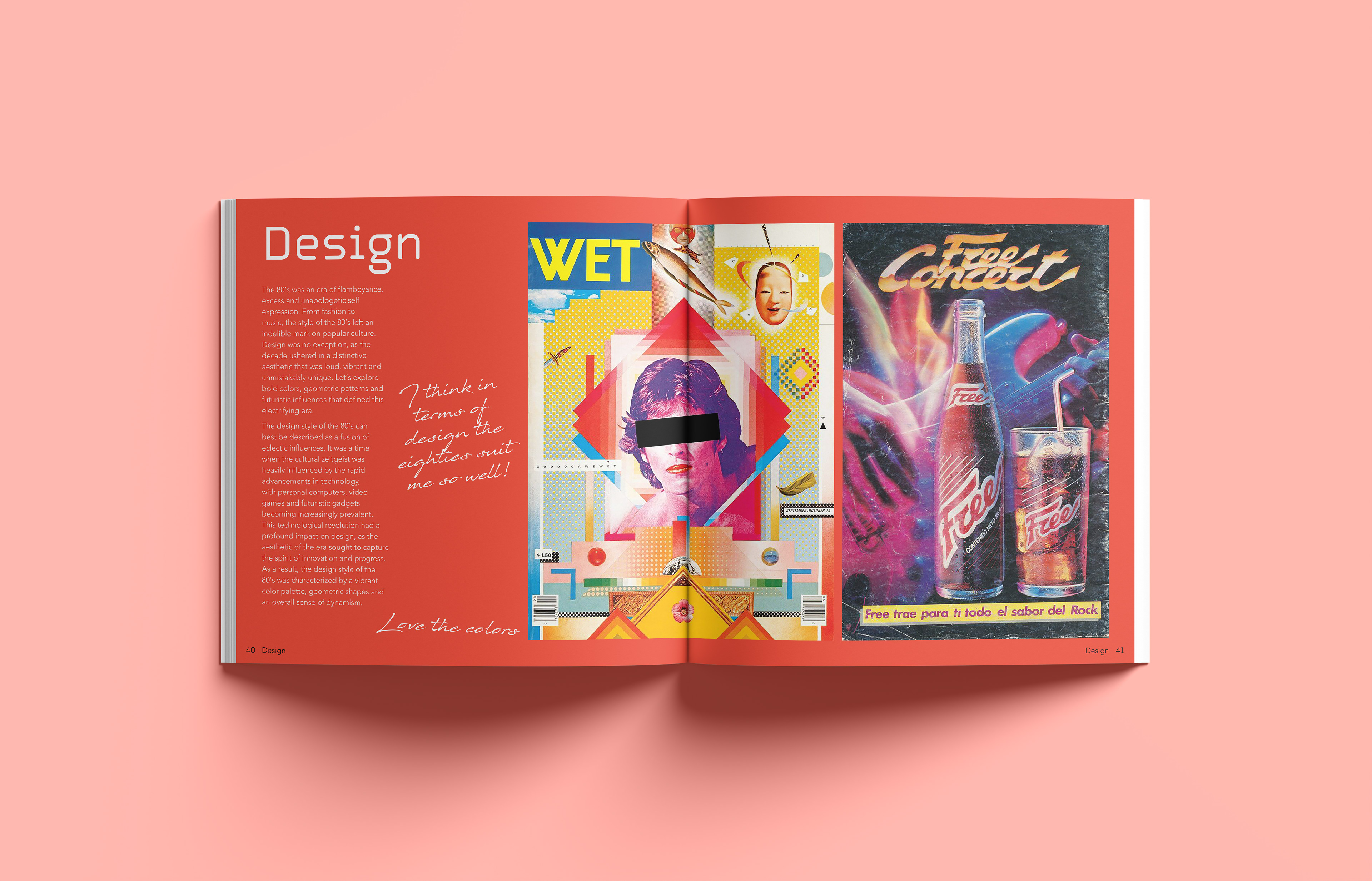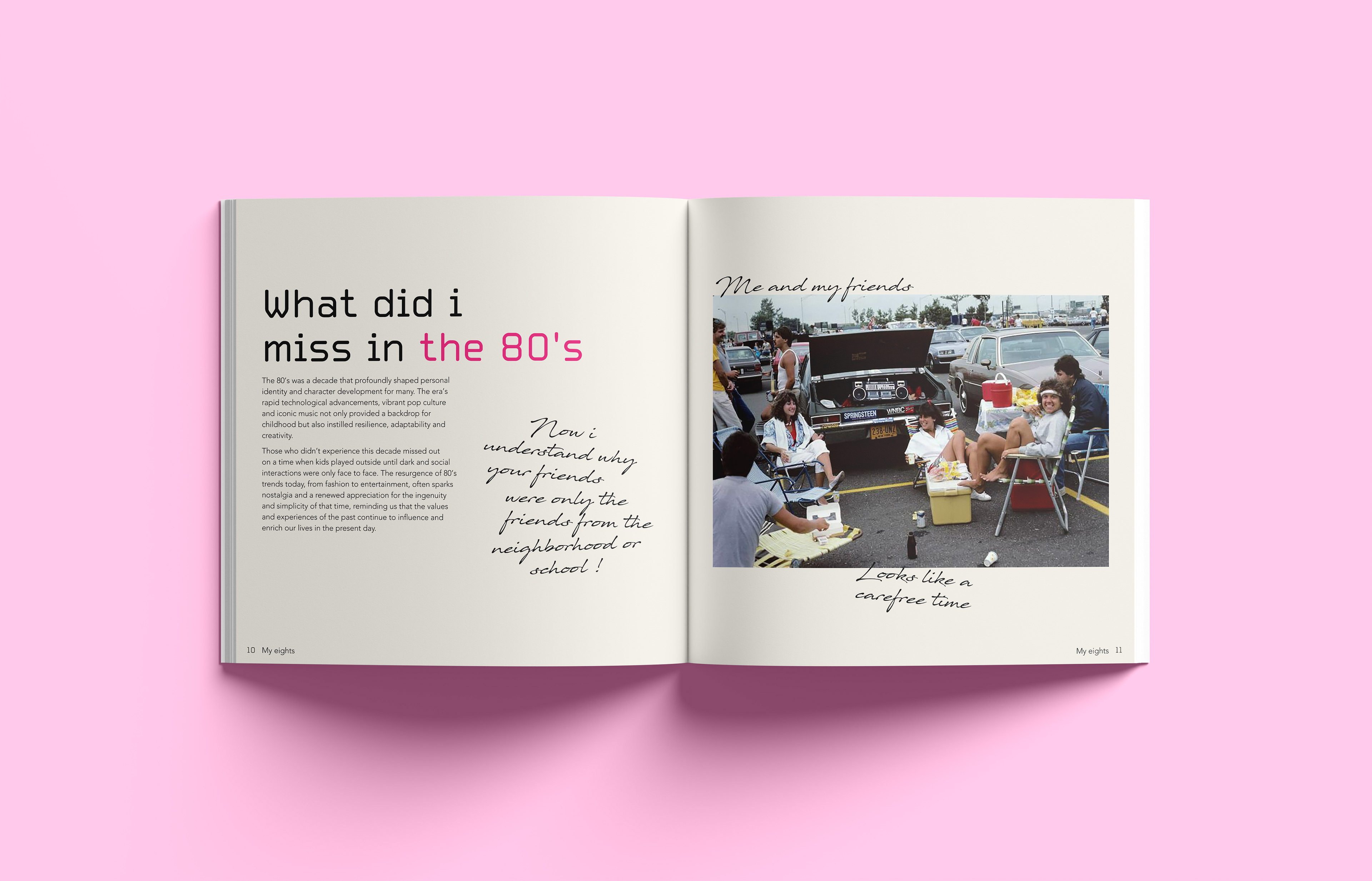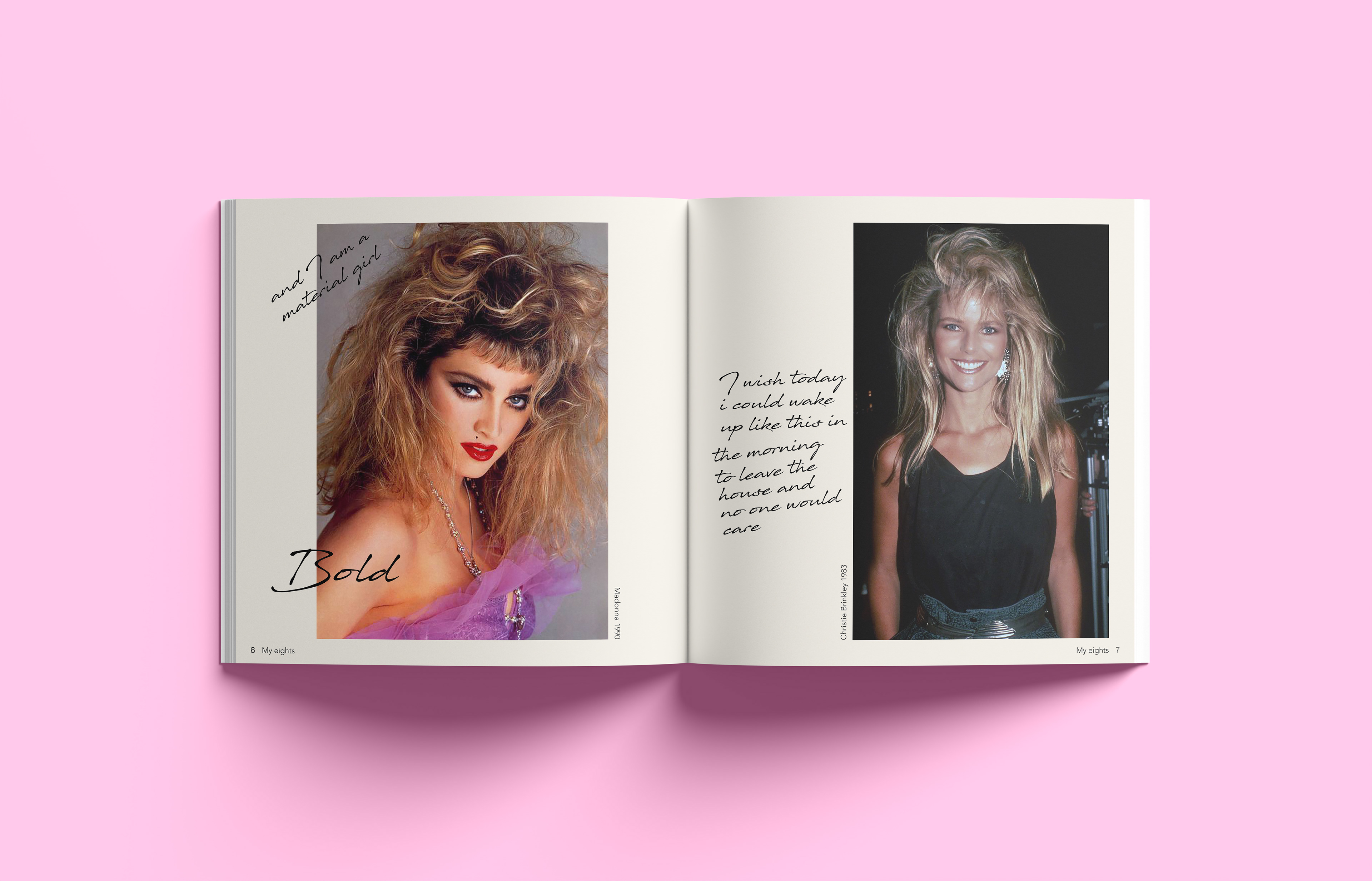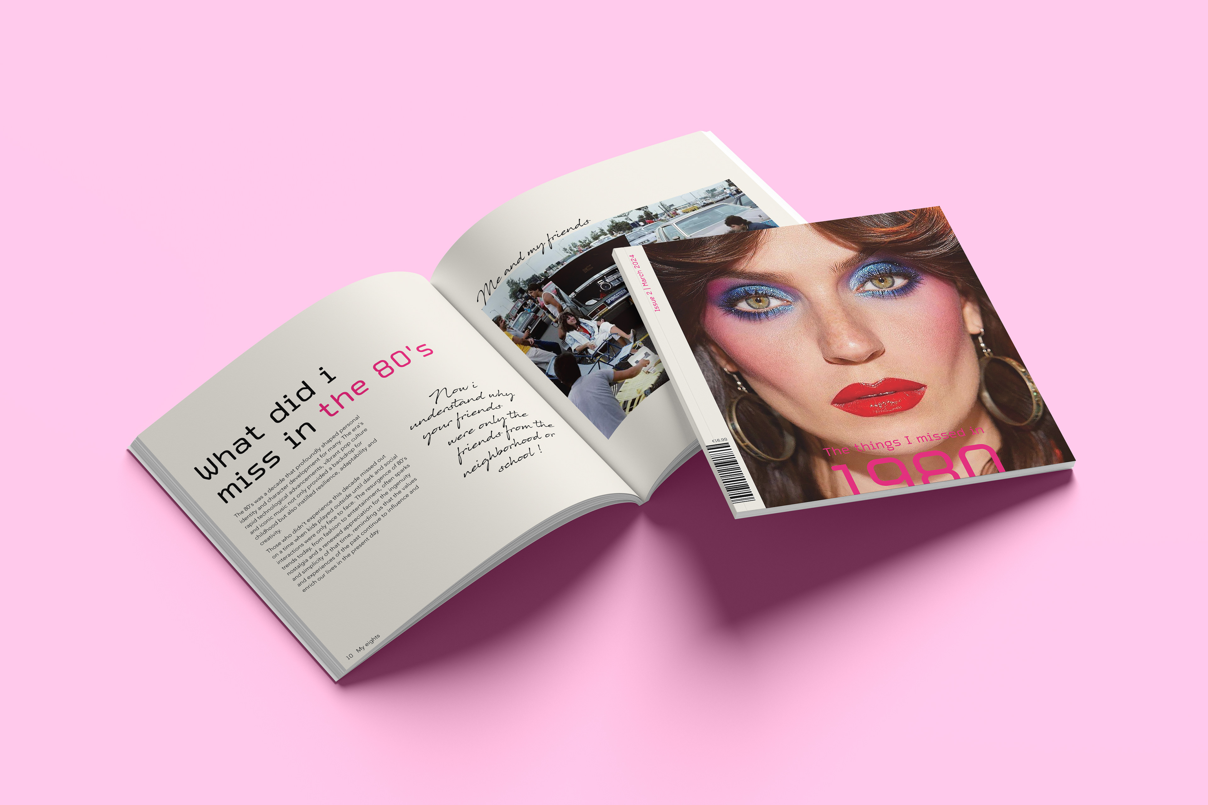 A nostalgic dive into an unknown era I explore the eighties through the lens of someone born in 2000. I cover subjects like fashion music and design reflecting on the unique cultural energy and analog aesthetics I feel I missed. The design brings together archival photography and contemporary commentary to bridge the time gap. I share my thoughts and impressions through handwritten notes placed alongside the images offering a subjective look at a time I never lived through yet feel deeply connected to. Editorial Design | 2023 | Design Factory International